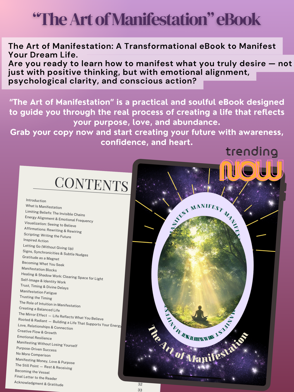 “The Art of Manifestation” is a powerful 36-page eBook that guides you through the real process of manifesting your dream life — not just through affirmations, but by aligning your psychology, energy, emotional state, and identity.